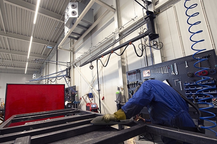 De CCM unit wordt op circa 2/3 hoogte van de hal gemonteerd, daar waar de lasrookdeken zich bevindt. Door middel van een robuust onderframe voorzien van uitsparingen voor heftruckvorken is de unit eenvoudig te plaatsen.